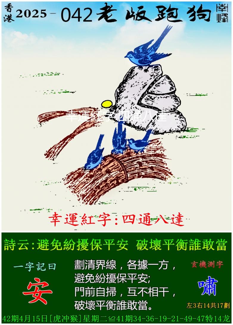 042期老版跑狗一字記之曰:【嘯】 詩雲:避免紛擾保平安,破壞平衡誰敢當。