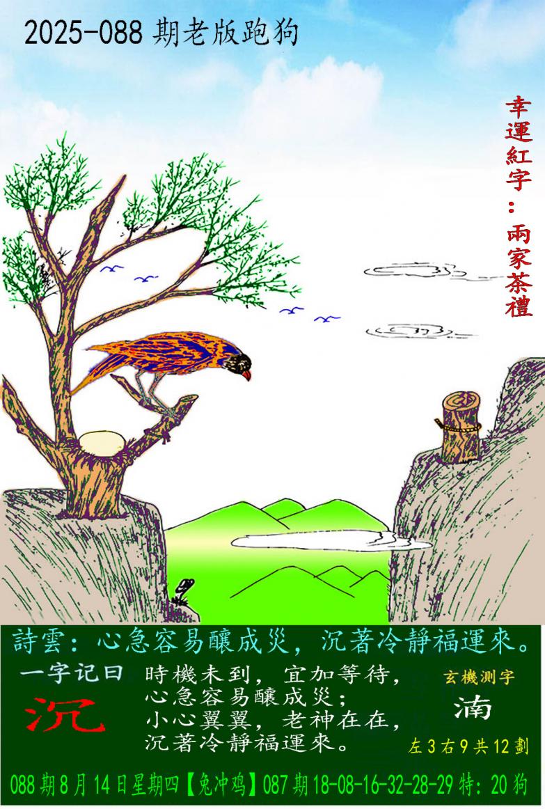 088期老版跑狗一字記之曰:【沉】 詩雲:心急容易釀成災,沉著冷靜福運來。