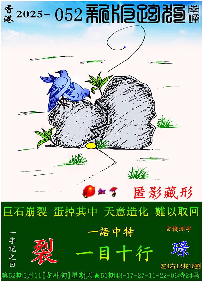 052期新版跑狗一字記之曰:【裂】 玄機測字:《璟》 一語中特:一目十行