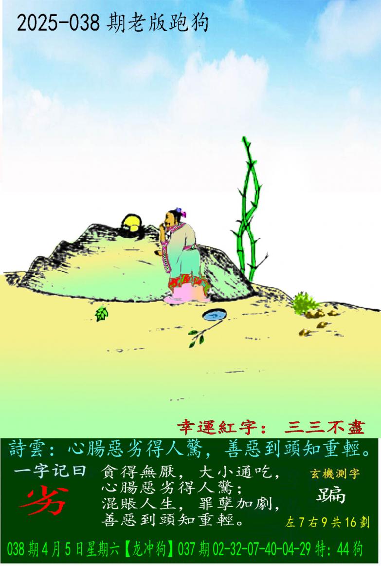 038期老版跑狗一字記之曰:【劣】 詩雲:心腸惡劣得人驚,善惡到頭知重輕。