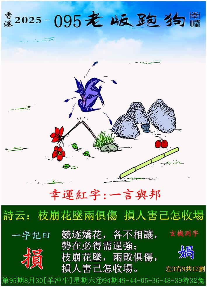 095期老版跑狗一字記之曰:【損】 詩雲:枝崩花墜兩俱傷,損人害己怎收場。