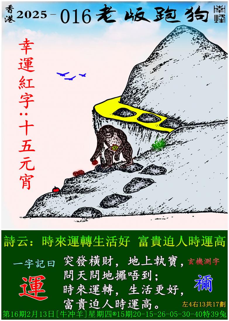 016期老版跑狗一字記之曰:【運】 詩雲:時來運轉生活好,富貴迫人時運高。