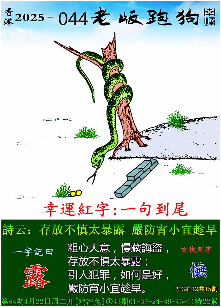 044期老版跑狗一字記之曰:【露】 詩雲:存放不慎太暴露,嚴防宵小宜趁早。