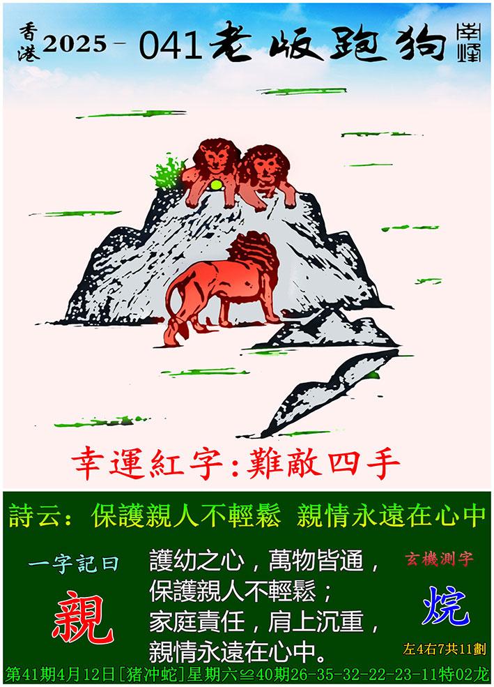041期老版跑狗一字記之曰:【親】 詩雲:保護親人不輕鬆,親情永遠在心中。