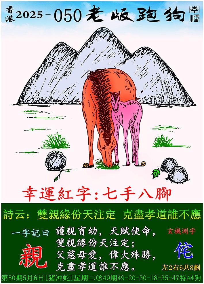 050期老版跑狗一字記之曰:【親】 詩雲:雙親緣份天注定,克盡孝道誰不應。